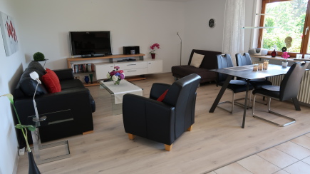 In der komfortablen Ledersitzgruppe relaxen. Fernsehen genießen oder bei Kaffee und Kuchen in die wunderschoene Natur schauen.